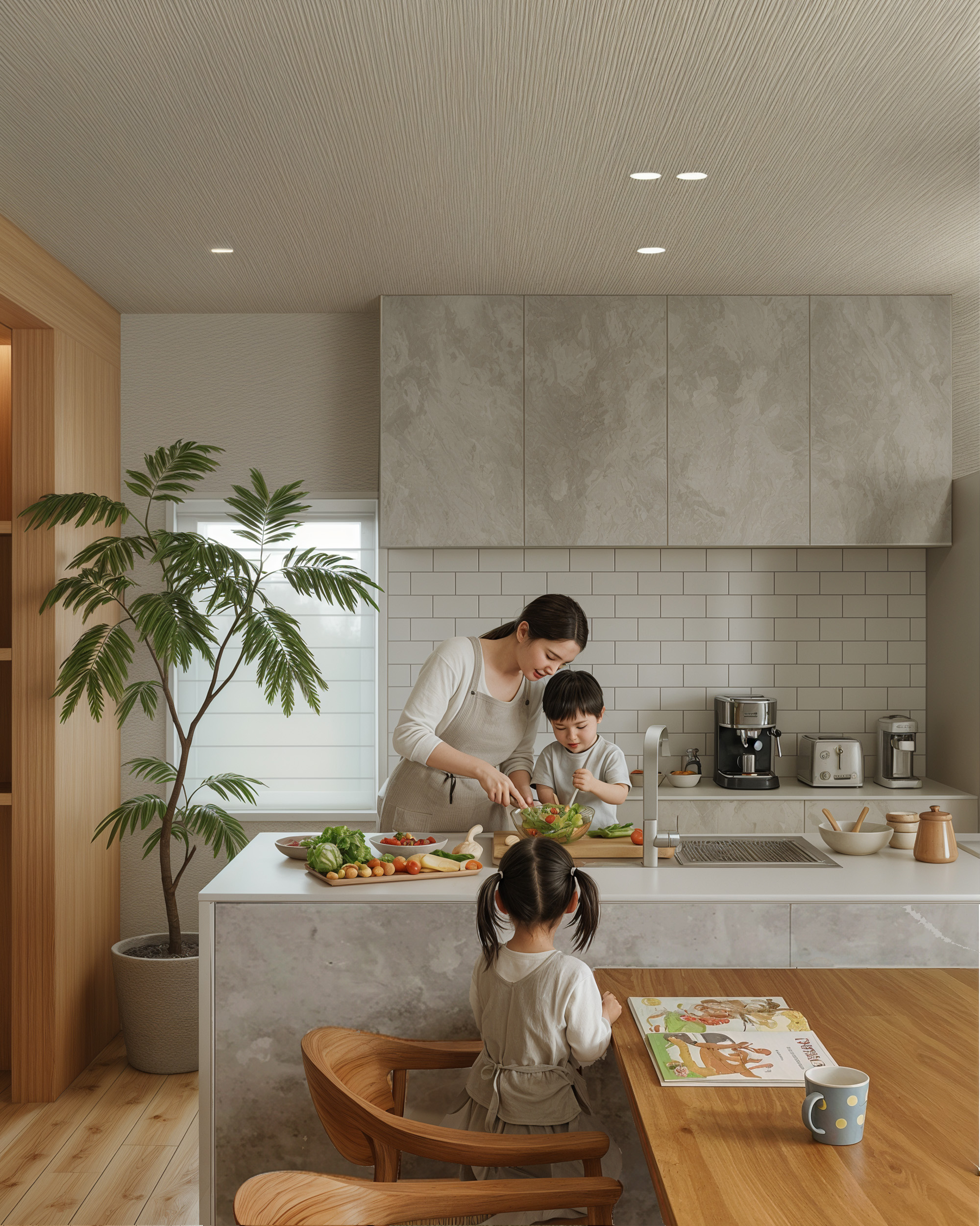 玄関ドアや床材、壁面などにオークを取り入れました。温かみのある木目を中心に、適度にグレーやブラックで空間を引き締め、ナチュラルでありながら上質なコーディネートに。家族とのくつろぎを大切にする空間で穏やかな日々を過ごすことができます。