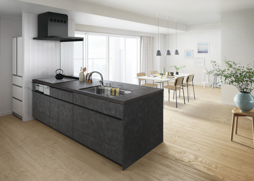 熱にも傷にも汚れにも強く、美しさを長く保てる理想的なワークトップ「セラミックトップ」やタッチレス水栓、フロントオープン食洗器、使いやすさと収納量を両立した「らくパッと収納」などを標準装備しています。