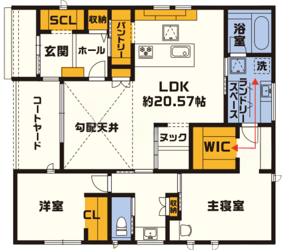 もう一つの特徴が、効率的な家事動線と片づけやすい収納系下記を盛り込んだ間取りです。洗濯の際の「洗う・干す・しまう」が完結する家事動線と子どもでも片付けしやすい収納で、忙しい毎日にゆとりを生み出します。