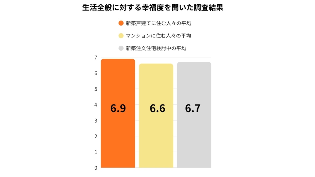 住居形態ごとの幸福度と家への満足度を比較した結果、新築戸建てに住む人々の幸福度の平均は6.9点で、マンション居住者の平均6.6点、新築注文住宅検討中の人々の平均6.7点を上回りました。