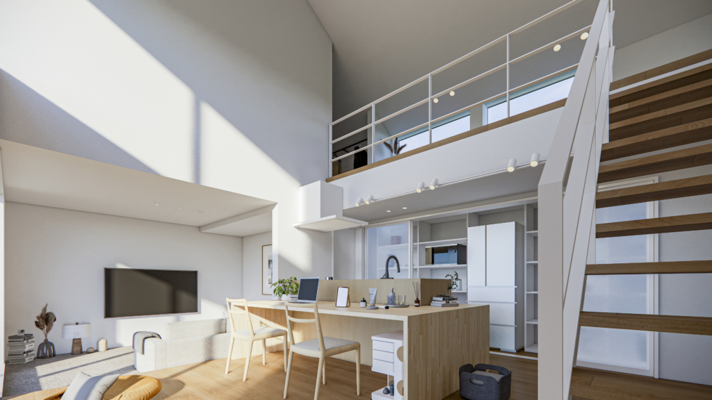 家族や友人と過ごす「シェア空間(パブリック)」と、一人の時間を大切にする「プライベート空間」を高低差で区切り、緩やかにつながる暮らしを実現します。