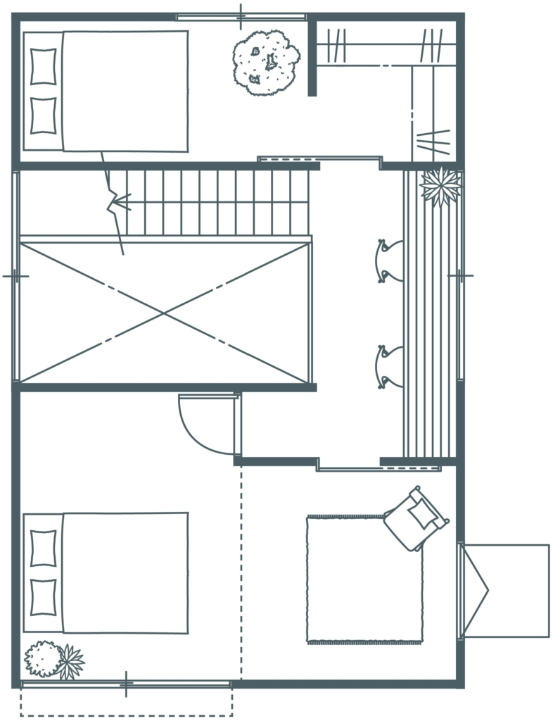 ・プライベートルームは死角で区切ることで、引戸を閉めずにゆるやかつながりながら一人の時間を大事にすることもできる