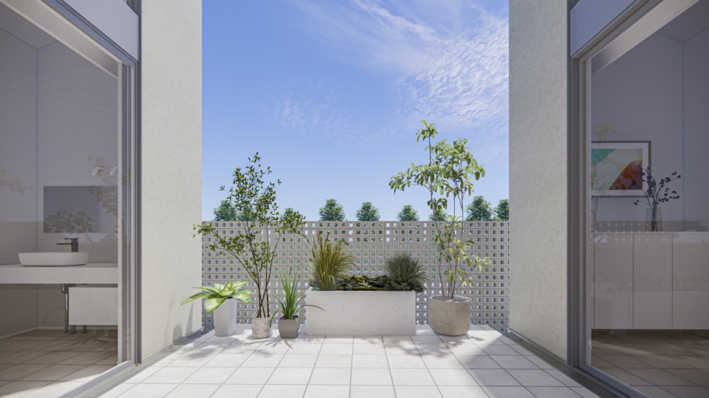 ・中庭の前には、目隠しの役割にもなる有孔ブロックを設置