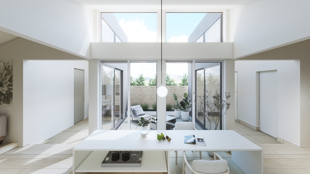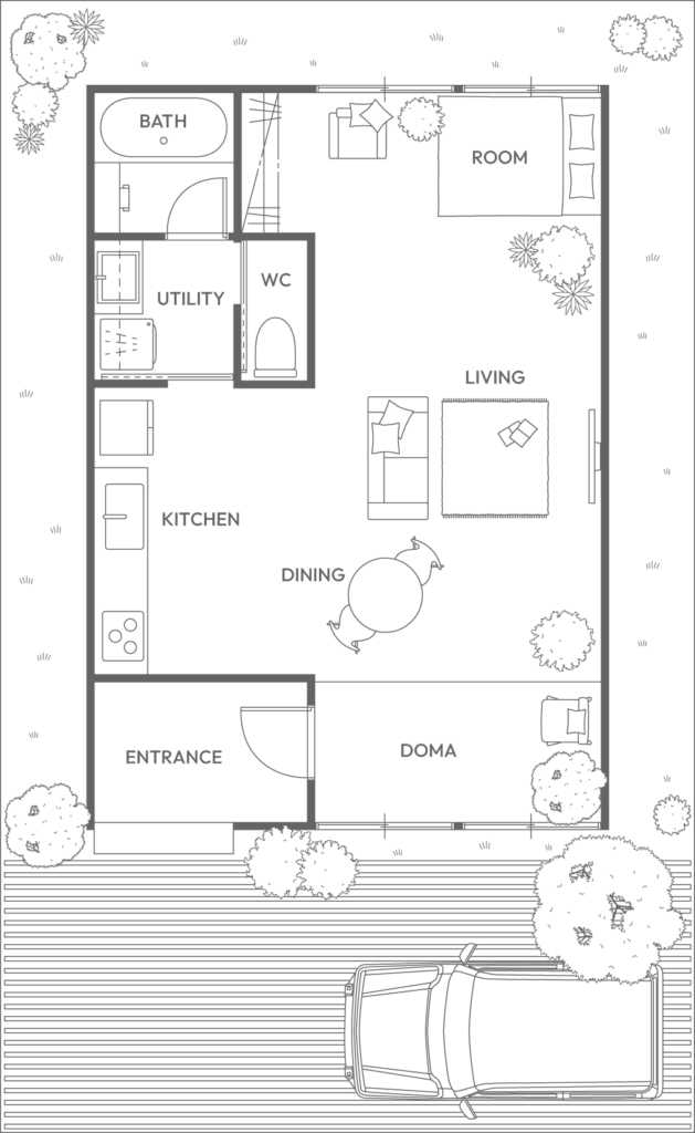 屋内外をシームレスにつなぎ、普段の生活と植物の居場所がひとつながりになる住まいを提案。