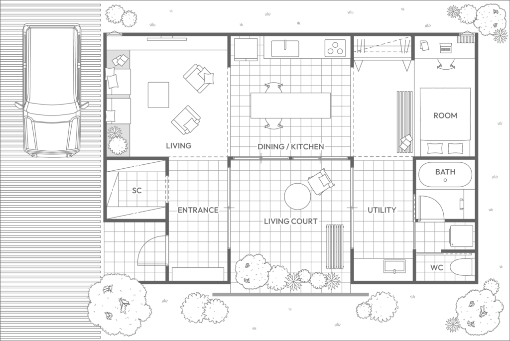 3方向からアクセスできる中庭を起点に、室内と屋外、日常と余暇がゆるやかにつながります。